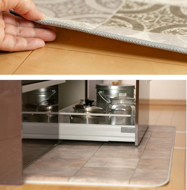 使う場所はキッチンだけでなく洗面台周りでも使用でき、他にもお部屋のポイントとして、ソファ・ベッド下や廊下敷きとして、窓際のフローリング日焼け保護マットとしてなど、それぞれの場所に合わせたサイズに作れるので、汚れやキズが気になる様々な場所で活躍します。