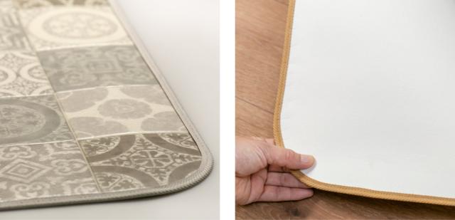 フチはしっかりとした縫製で、角が丸いので反りにくく、足も引っかかりにくくなっています。