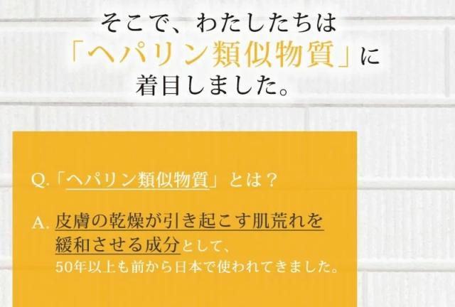 ヘパリン類似物質、グリチルリチン酸ジカリウム、精製水、ジプロピレングリコール、1,3−ブチレングリコール、濃グリセリン、ソルビット液、2−メタクリロイルオキシエチルホスホリルコリン・メタクリル酸ブチル共重合体液、ヒアルロン酸ナトリウム(2)、スクワラン、流動パラフィン、軽質流動イソパラフィン、ミリスチン酸イソプロピル、メチルポリシロキサン、ワセリン、セタノール、自己乳化型モノステアリン酸グリセリル、モノステアリン酸ソルビタン、ポリオキシエチレンラウリルエーテル(7E.O.)、ポリオキシエチレンセチルエーテル、ポリアクリル酸アミド、カルボキシビニルポリマー、キサンタンガム、水酸化カリウム、天然ビタミンE、エデト酸二ナトリウム、フェノキシエタノール、パラオキシ安息香酸メチル、パラオキシ安息香酸エチル