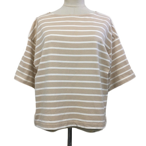 【中古】ローリーズファーム カットソー プルオーバー ボートネック ボーダー 五分袖 M ベージュ 白 ホワイト