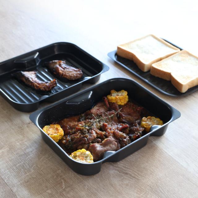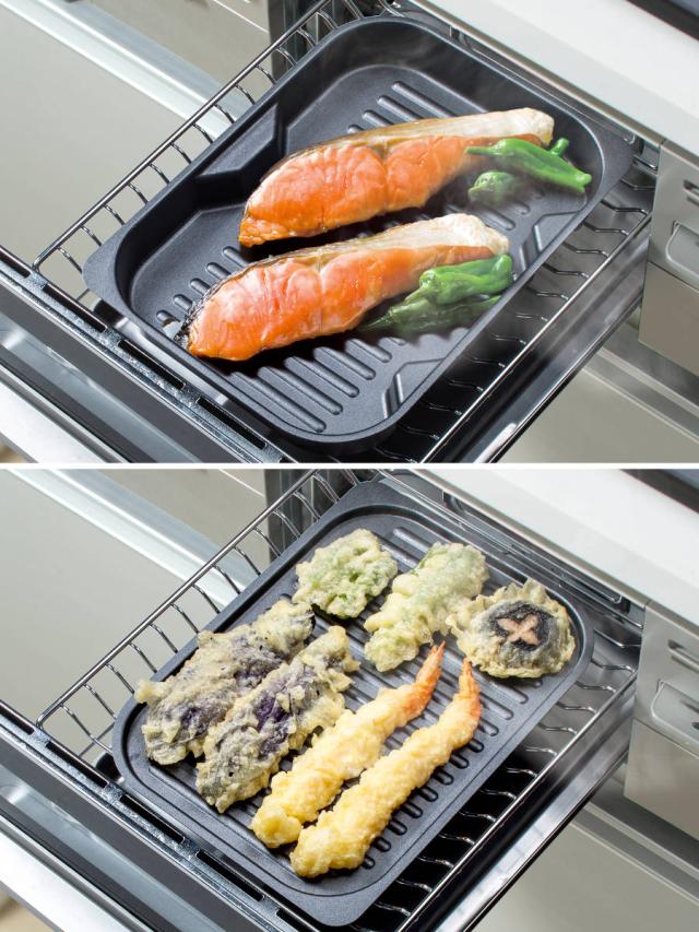浅型は焼き魚やグリル調理に、薄型は油が出ない餅やトーストに最適です。薄型は蓋としても使えるので、油の飛び散りが気になる料理に蓋をすればお掃除がさらに楽になります。