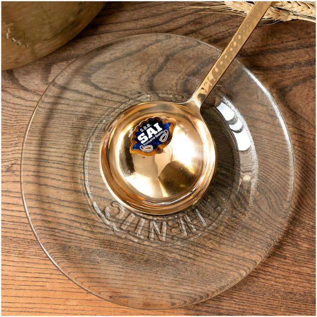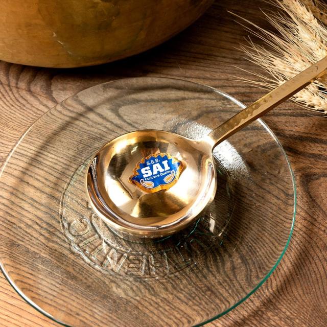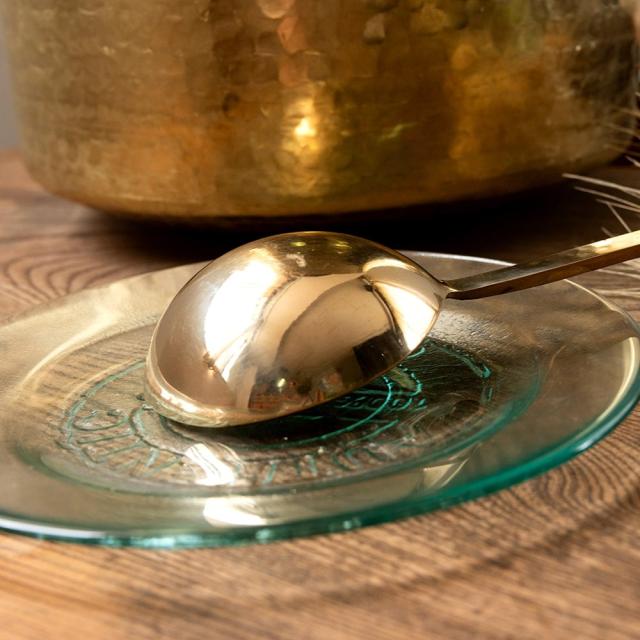日本では中々お目にかかれない、真鍮製のおたまです。大きな鍋でも安心な長い柄が特徴的です。インドではカレーや大皿料理を取り分けるときに使っています。