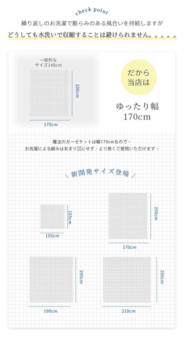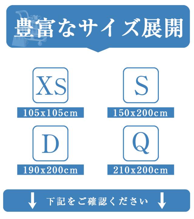 | ハーフサイズ(105×105cm) シングル (150×200cm) ダブル(190×200cm) クイーン (210×200cm) |