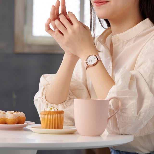 ケースサイズ約30mmと少し大きめサイズで、カジュアルなファッションにも合わせやすいシンプルなデザイン。12時の位置のダイヤと3、6、9時の位置のカットパーツがさりげない可愛さを演出しています。肌なじみが良いピンクのバンドは、環境に配慮した合成皮革「エコペット(ECOPET)」を使用しています。