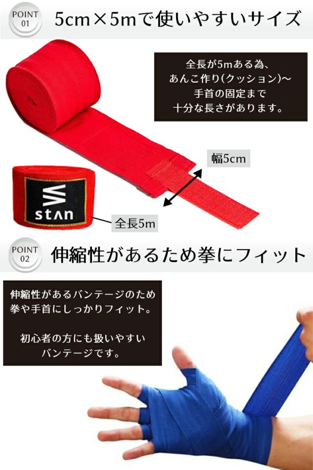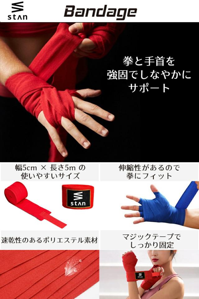 高い伸縮性で拳や手首にしっかりフィット! stan 格闘技バンテージ 。