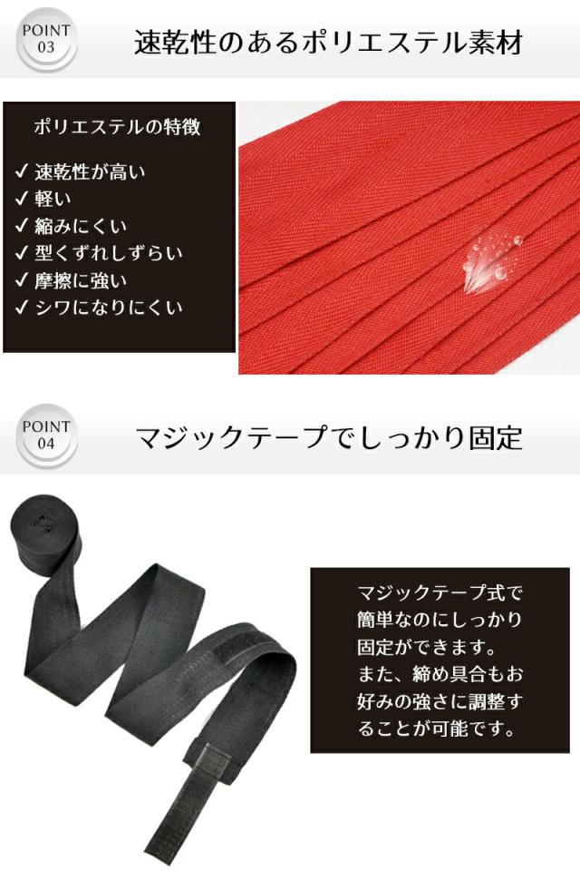 毎日のようにお使いいただけるように素材は洗濯後も乾きやすいポリエステル素材を使用しています。また、巻いた後の固定はマジックテープ式のため、しっかり固定でき、締め具合もお好みの強さに調整することが可能となっています。
