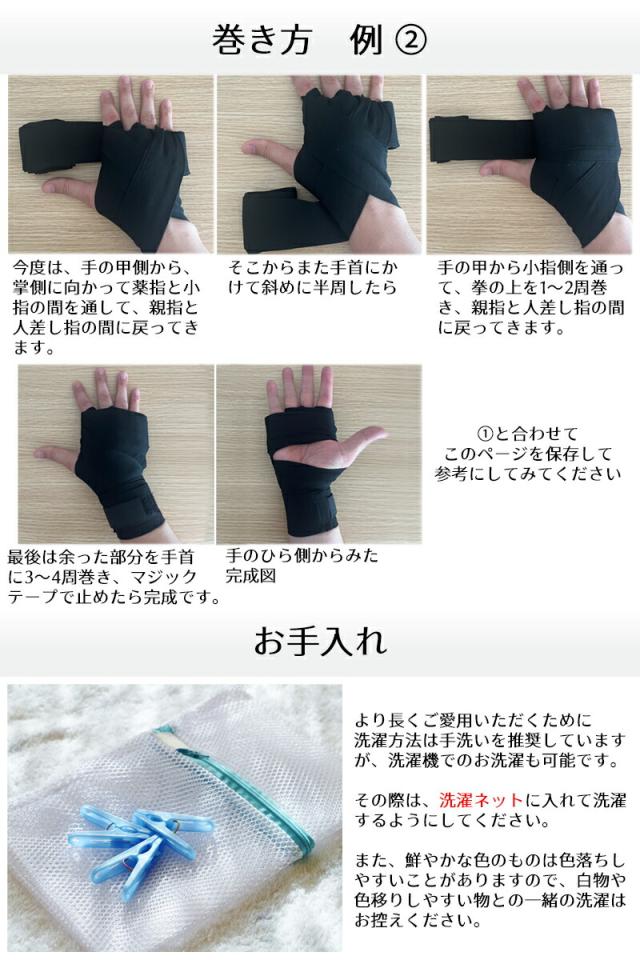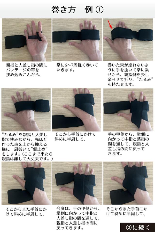 バンテージをつけてみたいけど巻き方がわからない…。そんな方のために巻き方の一例を掲載しております。巻き方1、2を保存してぜひ参考にしてみてください。