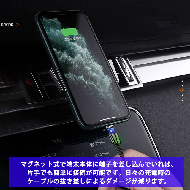 【製品説明】 ■仕様 5V/3A,9V/2A QC4.0 ※端末本体と充電器の両方が急速充電に対応していなければ、急速充電をすることができません。 ・3種端子セットケーブルを合わせて、1本で3役になるマグネット式充電ケーブルです。 スマホ、タブレット、ゲーム機など様々なデバイスを充電可能です。 3種端子は状況に応じてタイプを選べるので外出先でも大変便利にお使いいただけます。 ・マグネット着脱式なので日々の充電時のケーブルの抜き差しによるダメージが減ります。 端子をスマホ充電口に挿しておけば防塵にもなり、未然に故障や劣化を防ぎます。 また、端子ヘッドをスマホ本体に差し込んでおけば、充電時にセット商品のケーブルを近づけるだけで片手でも簡単に素早くマグネットの力で接続し充電がされます。 ■素材 折れにくく変形しにくい、断線防止の強化ナイロン編み加工ですので、コードも長持ちします。 |