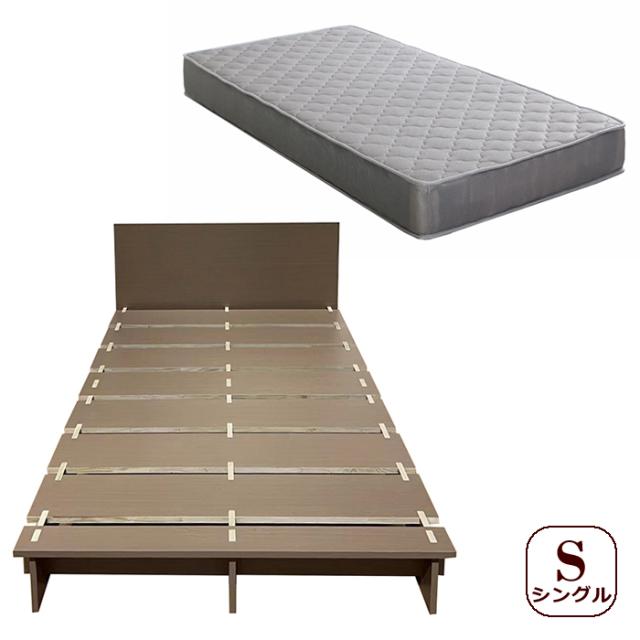 ネジを使わないベッド すのこ ヘッドボード付 棚 コンセント 木目調 単身 一人暮らし ポケットコイルマット(グレー)セット シングル ベージュ