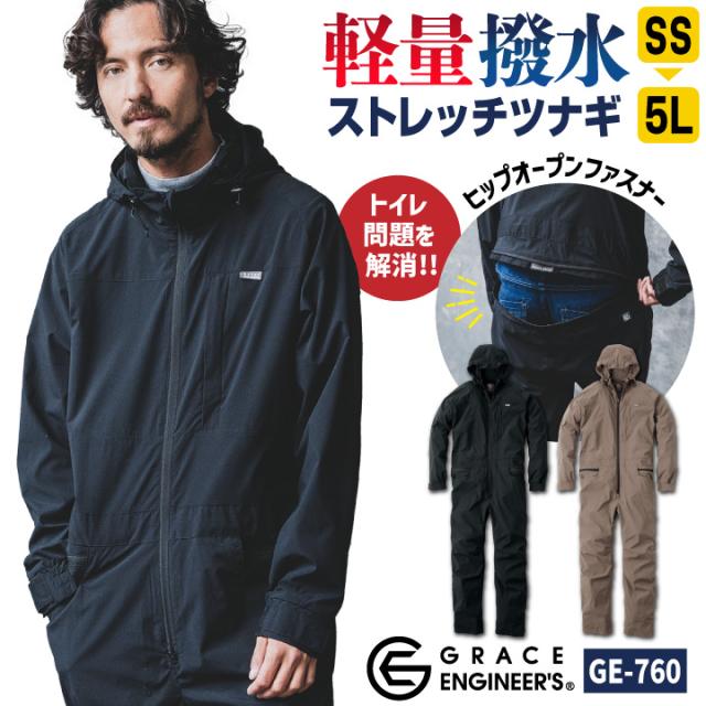 GRACE ENGINEER'S GE-760 ウォーターシェルツナギ ストレッチ性のある撥水加工を施した高密度タフタ素材。1枚で着ても薄手で軽やかな着心地。