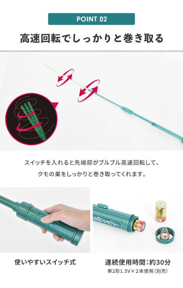 | クモの巣キャッチャー 電動式 約120〜216cm 替え穂先付 くもの巣 取り 電池 回転 巻き取る 軒下 庭先 玄関 便利グッズ 蜘蛛の巣キャッチャー くもの巣キャッチャー クモの巣クリーナー 電動 掃除機 掃除道具 清掃道具 クリーナー クモの巣取り 除去 駆除 対策 蜘蛛の巣 電池式 便利 らくらく |