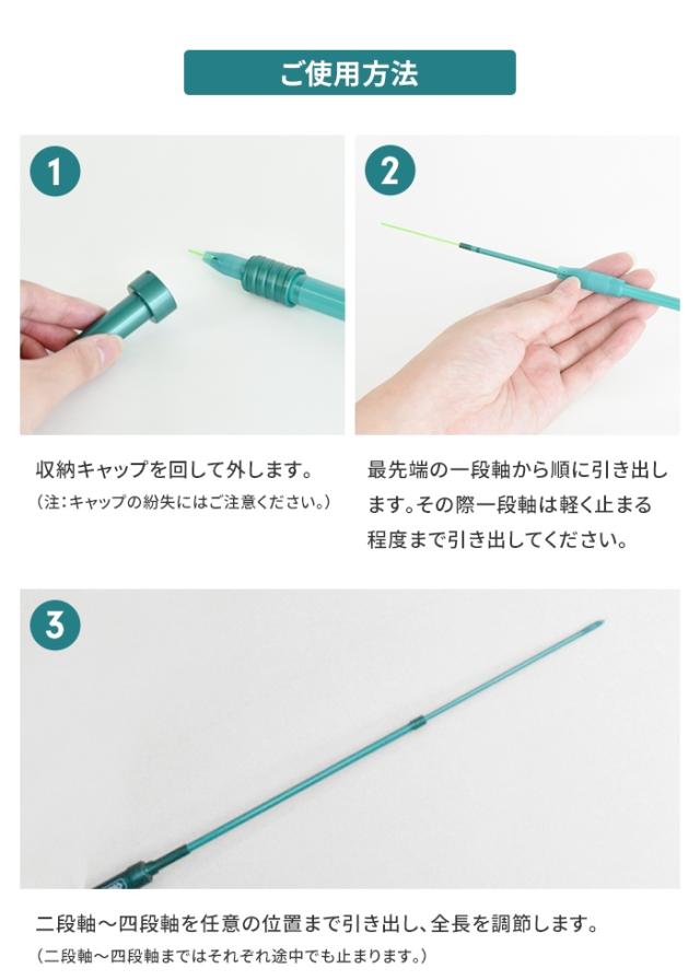 ・先端は細く危険です。軸を伸ばす際は周りに人がいないことを確認して行ってください。また、絶対に先端を人には向けないでください。