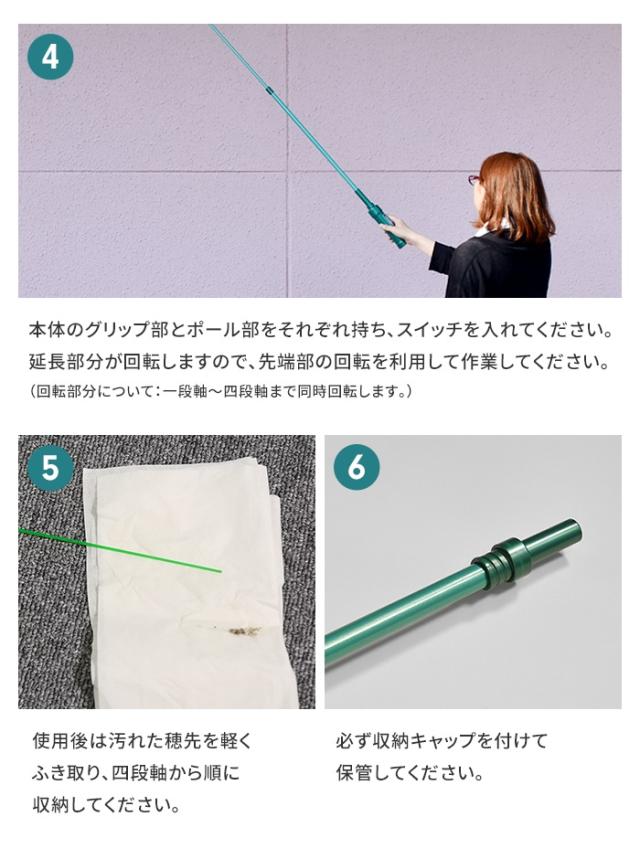 | [ご利用方法] 1.収納キャップを回して外します。 (注:キャップの紛失にはご注意ください。) 2.最先端の一段軸から順に引き出します。その際一段軸は軽く止まる程度まで引き出してください。 3.二段軸〜四段軸を任意の位置まで引き出し、全長を調節します。 (二段軸〜四段軸まではそれぞれ途中でも止まります。) 4.本体のグリップ部とポール部をそれぞれ持ち、スイッチを入れてください。 延長部分が回転しますので、先端部の回転を利用して作業してください。 (回転部分について:一段軸〜四段軸まで同時回転します。) 5.使用後は汚れた穂先を軽くふき取り、四段軸から順に収納してください。 6.必ず収納キャップを付けて保管してください。 |