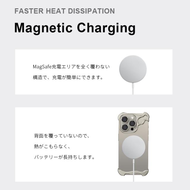 ケースを付けるのが嫌いだけど、保護対策がしたいです。そういう人に四隅だけを覆うバンパーケースをオススメします。覆う部分を最小限に設計したので、iPhoneのデザイン性を損なわず、本来の美しさを活かします。またMagSafe充電エリアを全く覆わない構造で、ワイヤレス充電が簡単にできます。しかもバックボードがないので、内部に熱がこもらず、放熱性が向上し、バッテリーも長持ちできます。