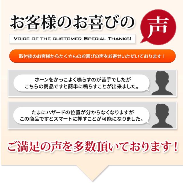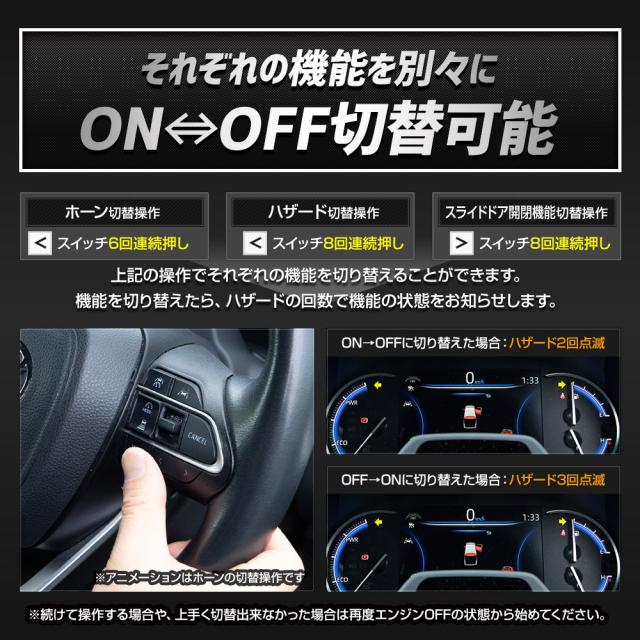 『スマートに連続ホーンを鳴らすのは難しい…』 『スライドドアの開閉や、サンキューハザードの際にスイッチまで手を伸ばすのがちょっと手間…』 こんな不満を抱えている方に是非試してもらいたいのが本製品! 純正カプラーの間に本製品を割り込ませるだけで、ハンドルスイッチの操作で簡単に『連続ホーン』&『自動ハザード』、さらには『スライドドア開閉』の動作が行えるようになります! ■サンキューホーン(連続ホーン) 指定のハンドルボタンを2回押すだけで、ホーンを短く三連続で『パパパン』とかっこよく鳴らします。 ■サンキューハザード(自動ハザード) 指定のハンドルボタンを3回押すだけで、ハザードが4回点滅します。 点滅後は自動で消灯するため、ボタン操作が1度で済み、ハザードの消し忘れも無くなります! ■スライドドア開閉操作 指定のハンドルボタンを長押しするとスライドドアがオープンし、もう一度長押しするとクローズします。 ルームランプスイッチまで手を伸ばす必要がなくなり、便利になります♪ それぞれの機能を簡単にON⇔OFF切替可能 ハンドルスイッチの簡単な操作だけで、それぞれの製品機能をオフにして純正の状態に戻すことができます。 ホーン機能はOFFにして、ハザード機能だけをONにすることなども可能です! わざわざ製品を外さずに純正に戻すことができるのも便利です。 完全カプラーオンで取り付け安心! 純正配線を傷付けずに製品の取り付けが可能です。 写真付き取扱説明書も付属しているので取り付けも安心です♪ |