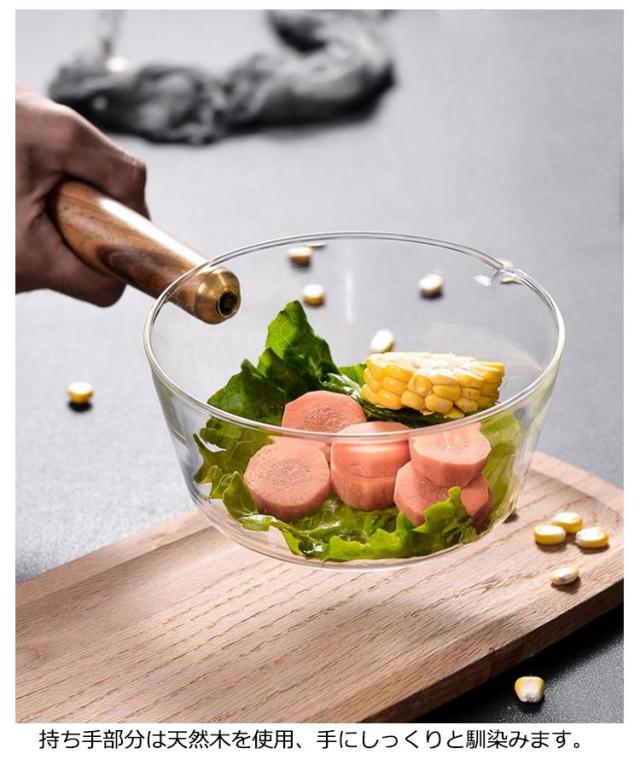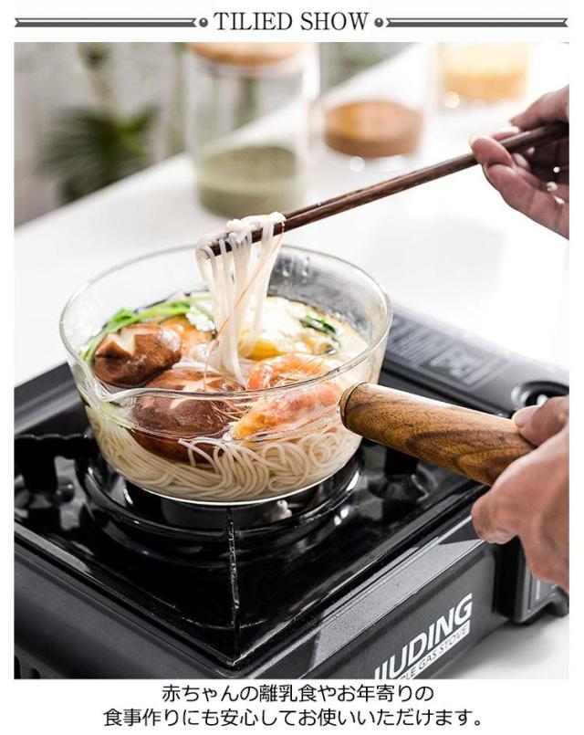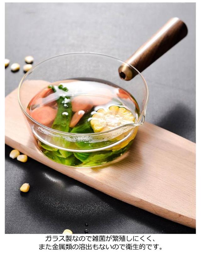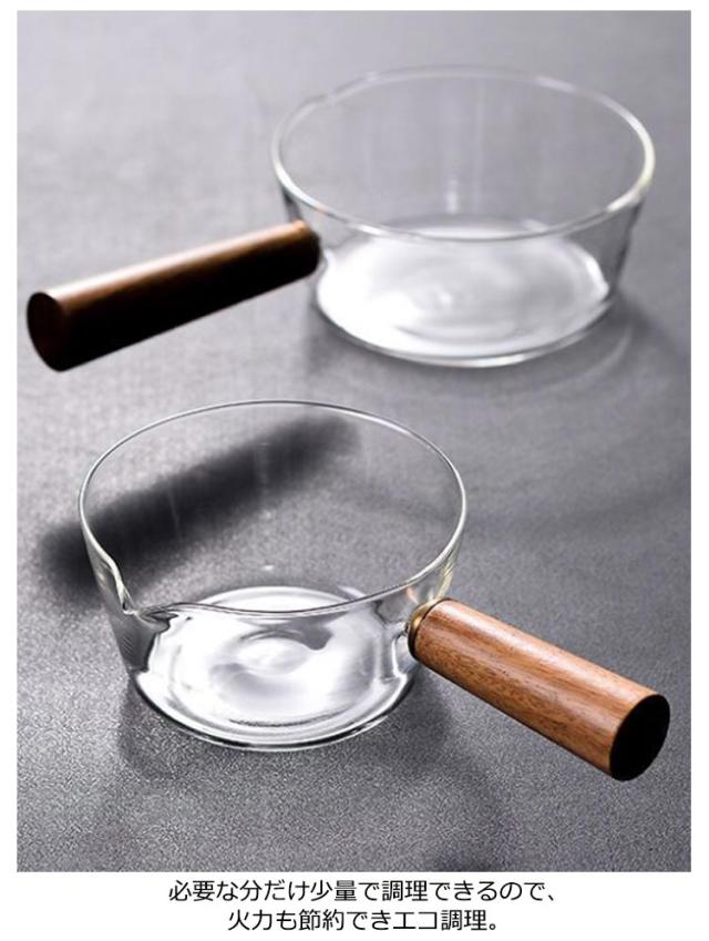 | 中身が一目で確認できるガラス製片手鍋。 赤ちゃんの離乳食やお年寄りの食事作りにも安心してお使いいただけます。 ガラス製なので雑菌が繁殖しにくく、また金属類の溶出もないので衛生的です。 必要な分だけ少量で調理できるので、火力も節約できエコ調理。 持ち手部分は天然木を使用、手にしっくりと馴染みます。 | |
