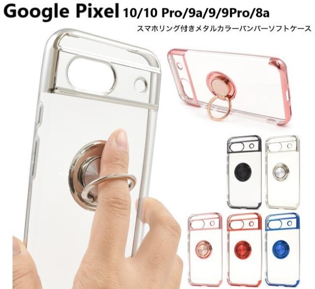 落下防止用のスマホリングが付いた、 Google Pixel 10a / Google Pixel 10 / Google Pixel 10 Pro / Google Pixel 9a / Google Pixel 8a / Google Pixel 9 / Google Pixel 9 Pro 専用のメタルカラーバンパーソフトクリアケースです。