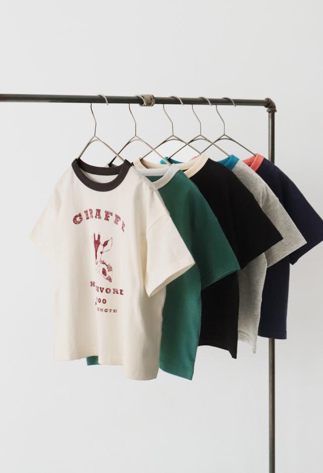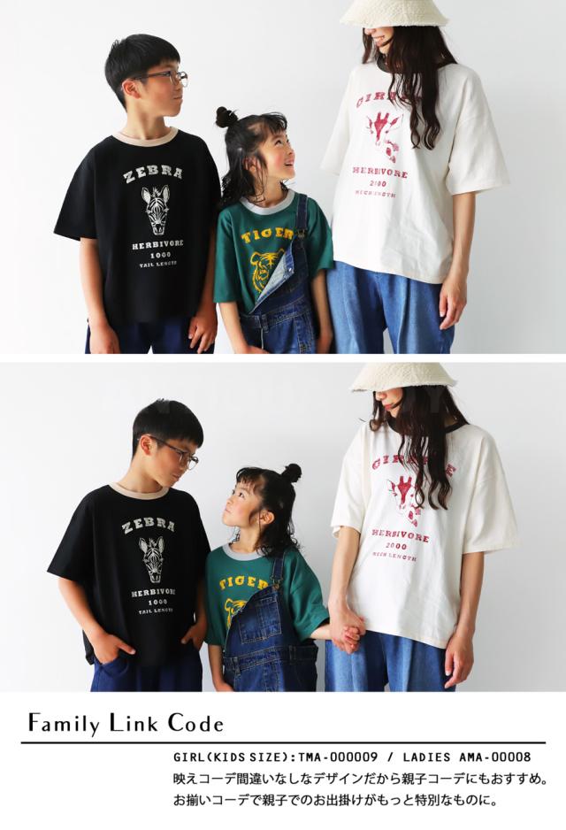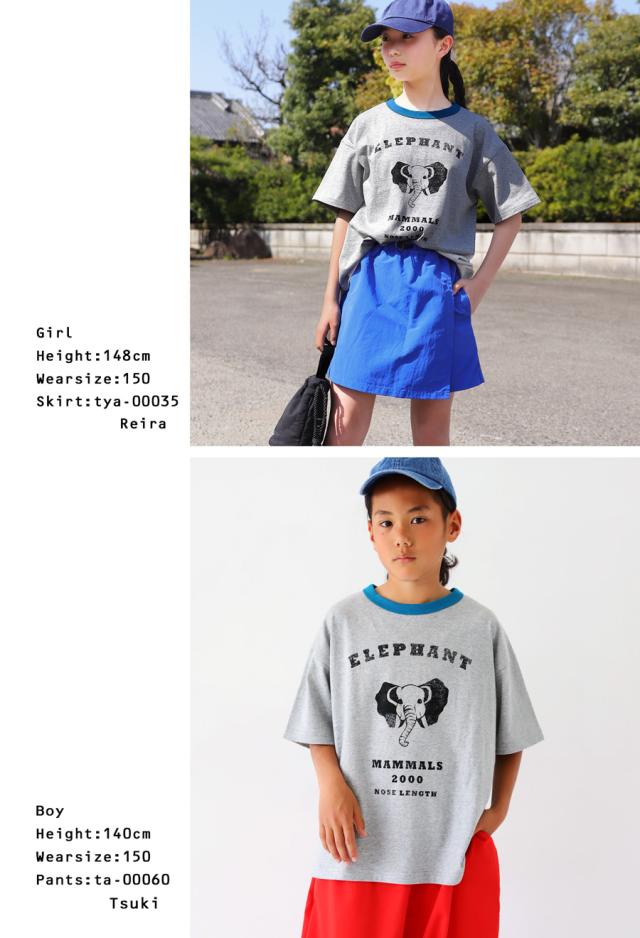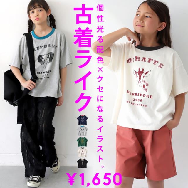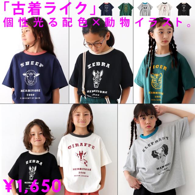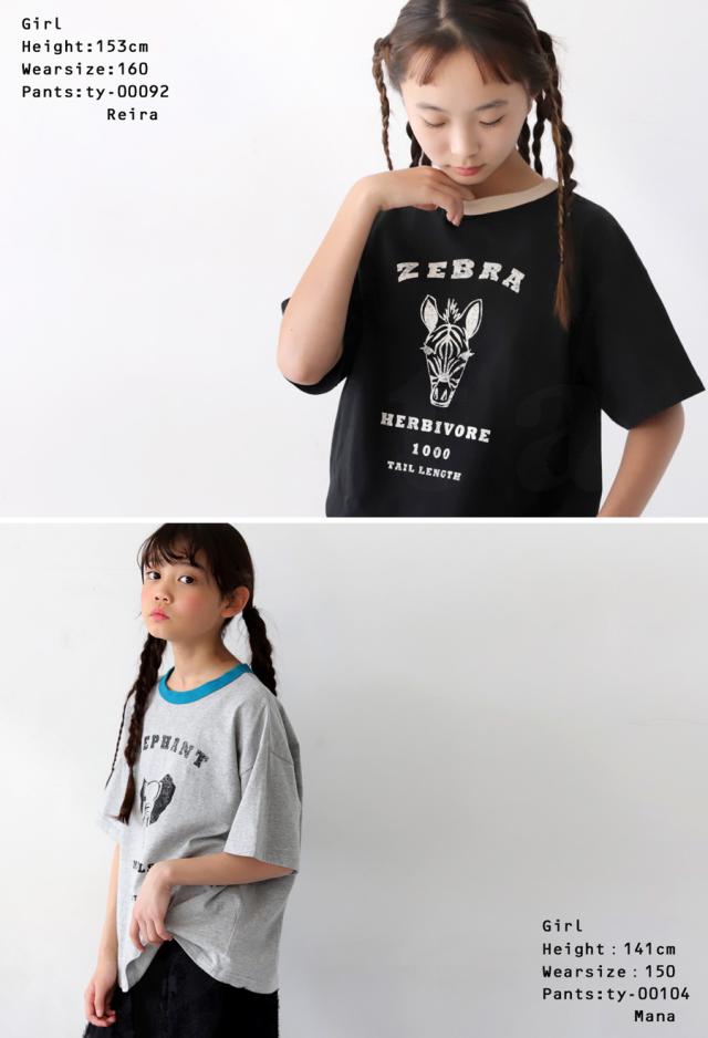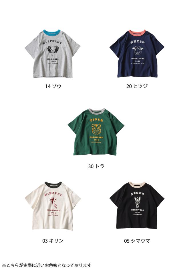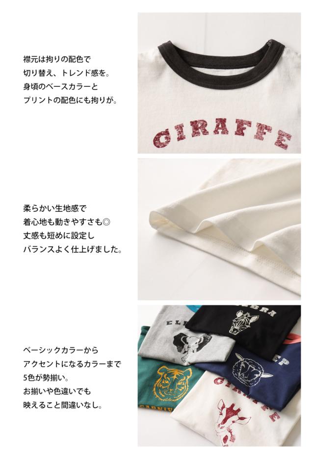 tma-00009j キッズ 子供服 男の子 女の子 ジュニア 高学年 中学生 中高生 綿100 カットソー 半袖 五分袖 アニマルプリント 配色 クルーネック 丸首 ロゴT 手描き 象 キリン