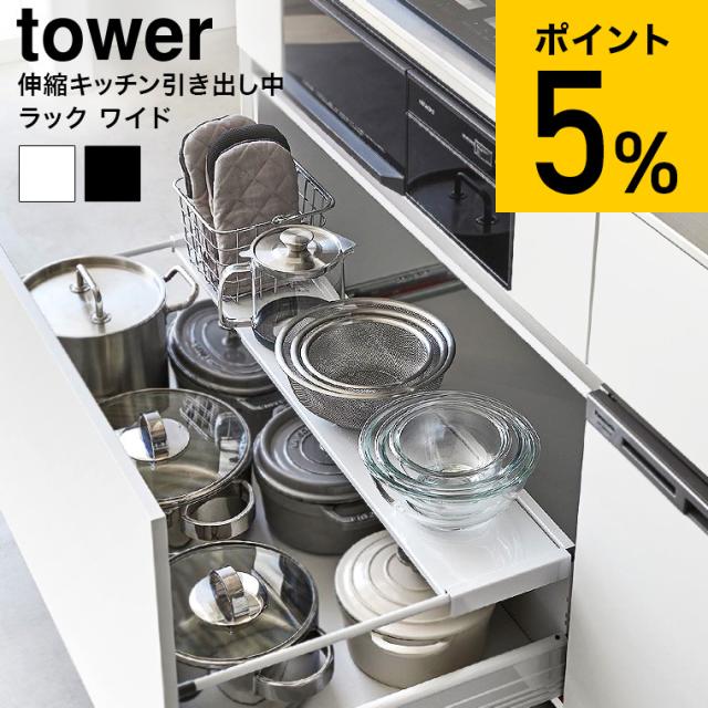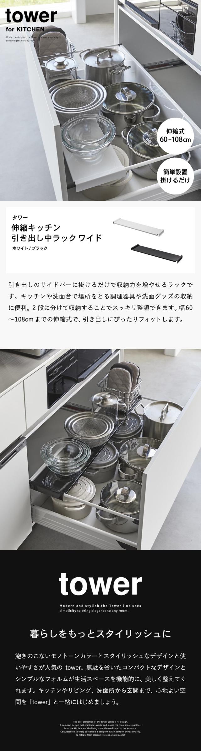 山崎実業 tower 伸縮キッチン引き出し中ラック タワー ワイド 収納 送料無料 1731 1732 ホワイト ブラック シンク下 伸縮ラック 収納ラック 引き出し 2段収納 伸縮式 キッチン 洗面台