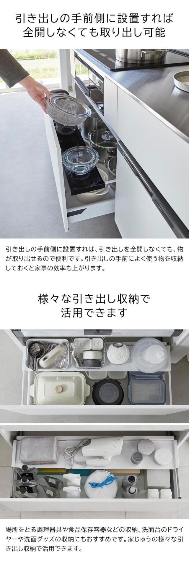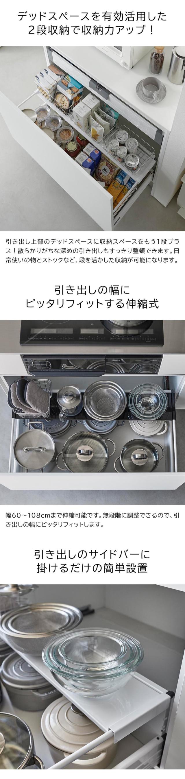 引き出しのサイドバーに掛けるだけで収納力を増やせるラックです。キッチンや洗面台で場所をとる調理器具や保存容器、洗面グッズやストック類の収納に便利。2段に分けて収納することで、ストックと日常使いの物を分けて収納するなどスッキリ整頓できます。幅60〜108cmまでの伸縮式で、引き出しにぴったりフィットします。引き出しの手前側に設置すれば、引き出しを全開しなくても物が取り出せるので便利です。