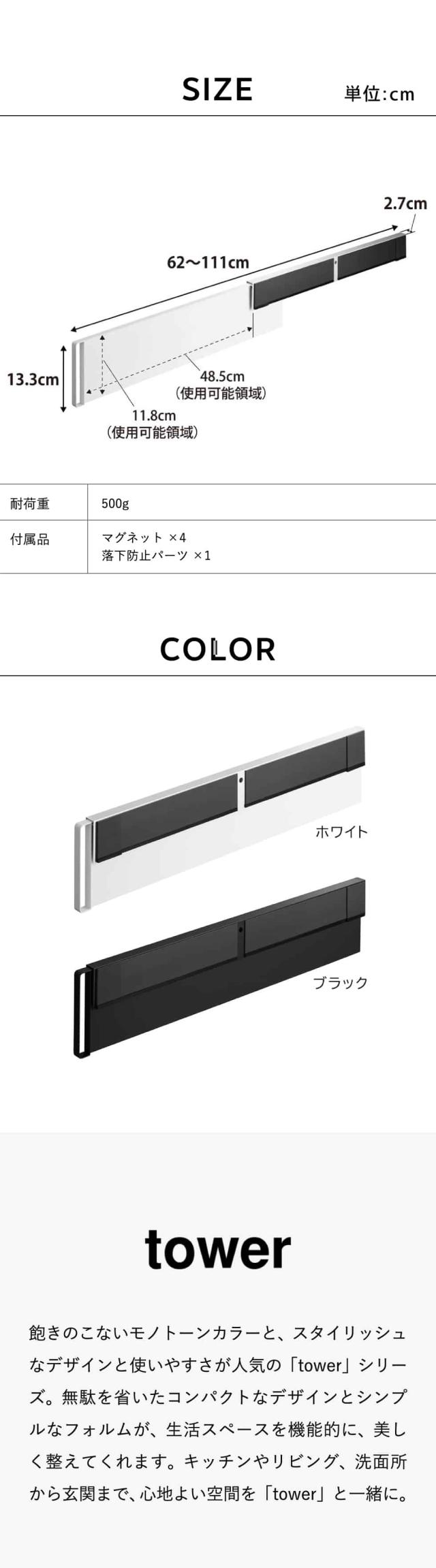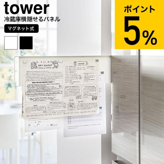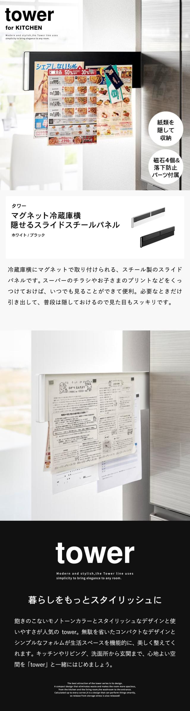 冷蔵庫横にマグネットで取り付けてプリント類を保管できるパネル。普段は隠しておけてすっきり、見たい時だけ引き出せます。ワイド&両面が使用可能 。 タワーシリーズ yamazaki