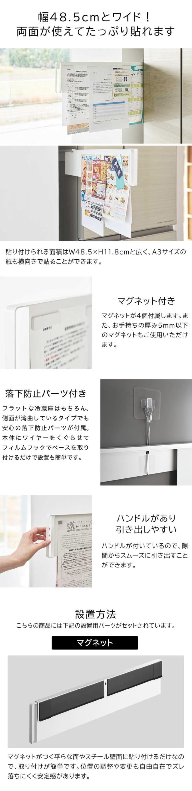 冷蔵庫横にマグネットで取り付けられる、冷蔵庫専用スチール製のスライドパネルです。スーパーのチラシやお子さまのプリントなどをくっつけておけば、いつでも見ることができて便利。必要なときだけ引き出して、普段は隠しておけるので見た目もスッキリです。付属でマグネットが4個付いています。※お手持ちのマグネットを使用する場合は厚み5mm以下の物をご使用ください。裏面にも貼ることができます。※冷蔵庫を置く場所や隙間の幅によっては、裏面に貼ることはできません。