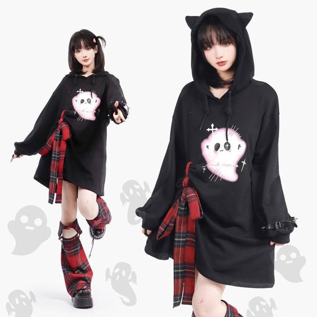猫耳フードにゴーストプリントがかわいいゴシック系トップス。