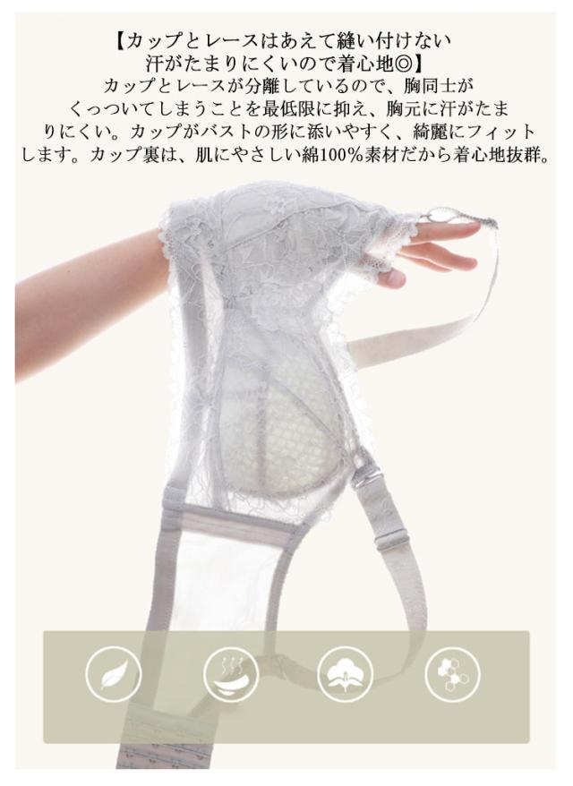 | 【バストの膨らみ、立体感を抑えた独自のカップ】より胸を小さく見せるようカップの膨らみは極限まで抑えつつ、自然で美しいバストラインを実現。胸を押し潰すだけじゃない独自設計だから、ストレスフリー。 【伸縮性のあるレースではみ出る胸をしっかりホールド】フロント上部に伸縮性のあるゴムを入れ、視線が気になる谷間部分も高級感のあるラッセルストレッチレースでしっかりガード。さらに小胸に見えるよう設計しました。バスト全体をレースで覆っているので苦しくなりません。 【脇高設計!Wのボーンで流れるお肉をしっかりキャッチ】脇高のWボーンでお肉が脇に流れるのを防ぎ、気になるはみ肉の凸凹もスッキリ綺麗に。より脇のほうまでワイヤーを伸ばすことで、脇肉を集めてシルエットをスッキリさせます。 【太めの15mmストラップでバストをキープ】肩への負担が少ない太めのストラップを採用。ストラップの付け根部分が幅広の三角形になっているので、胸のお肉が流れるのをせき止め、大きなバストをしっかり支えます。3列3段のホックを採用しているから背中もしっかりホールド。 【カップとレースはあえて縫い付けない 汗がたまりにくいので着心地◎】カップとレースが分離しているので、胸同士がくっついてしまうことを最低限に抑え、胸元に汗がたまりにくい。カップがバストの形に添いやすく、綺麗にフィットします。カップ裏は、肌にやさしい綿100%素材だから着心地抜群。 | |