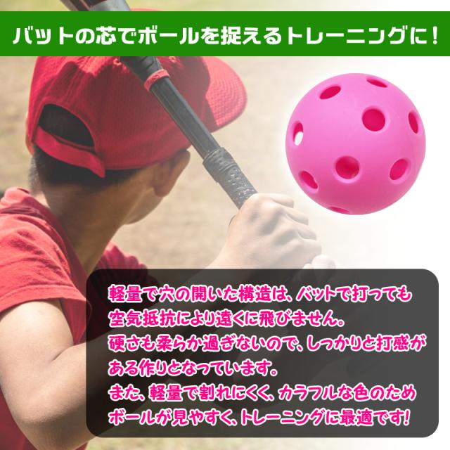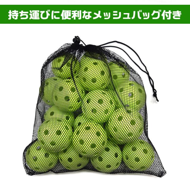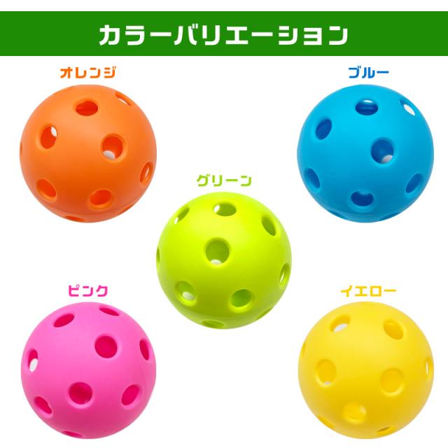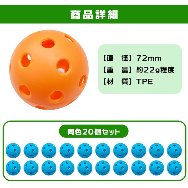 穴あきボール 72mm 20個セット 専用メッシュバッグ付き 硬すぎず柔らかすぎず 打感あり バッティング練習 打撃練習器具 練習球 穴空き トスバッティング 少年野球 飛ばないボール 軽い軽量 割れにくい 子供こども おもちゃ 黄色イエロー緑色グリーン青ブルー オレンジ ピンク