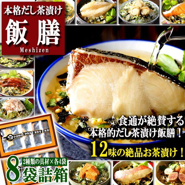 特上の締めのご馳走!本格だし茶漬け飯膳[8袋詰箱] (鰤 炙り河豚 辛子明太子 しらす 桜えび 蟹 鱈子)
