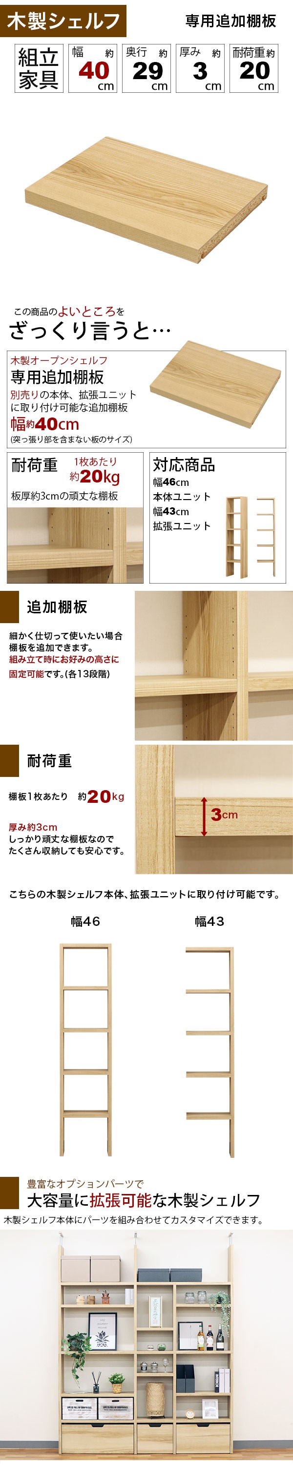 商品名:壁面収納 A4対応 本棚 オープンラック用の追加棚板(オプション棚板) 幅40cm 内寸40幅の本体に対応 奥行29.3cm(約30cm) 高さ3.1cm 大容量 収納棚 収納ラック シンプルナチュラル おしゃれ A4ファイル ランドセル 学用品 おもちゃ お道具箱 絵具セット 習字セット 1枚単品 教科書 絵本 楽譜 オフィス収納 カスタマイズ可能な北欧風モジュラーシェルフ モジュールシェルフ モジュールラック 丈夫な壁面ラック 耐久性があるオープンシェルフ 見た目がきれいなマガジンラック カスタム可能な 高品質なディスプレイラック 収納力が高いブックシェルフ たくさん収納できるウォールラック 収納アイディア 収納テクニック 絵本棚 壁面本棚 棚板のみ