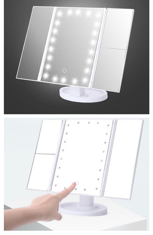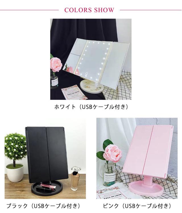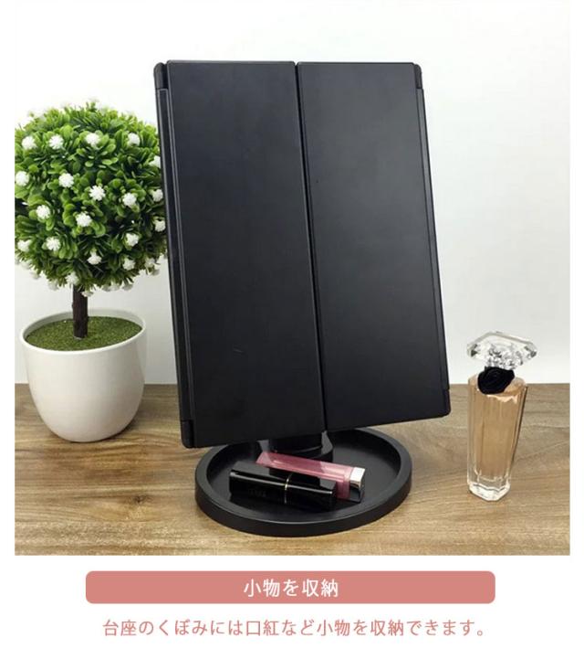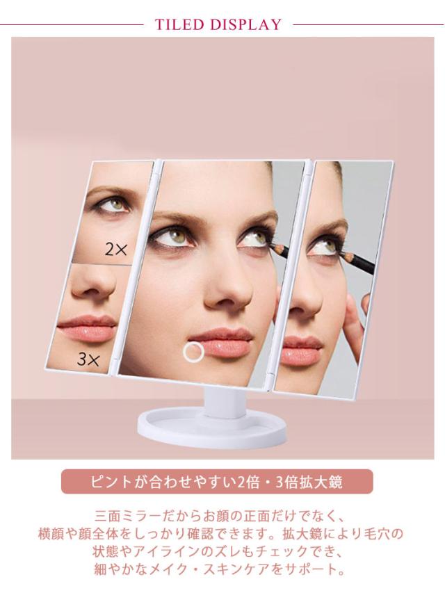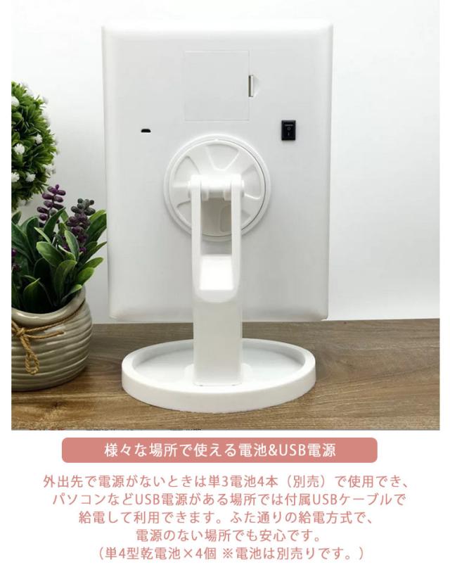 | 見やすい拡大鏡付き三面鏡 USB・電池式両用タイプ USBケーブル付き ピントが合わせやすい2倍・3倍拡大鏡:三面ミラーだからお顔の正面だけでなく、横顔や顔全体をしっかり確認できます。拡大鏡により毛穴の状態やアイラインのズレもチェックでき、細やかなメイク・スキンケアをサポート。 お肌を明るく照らすLEDライト:22個のLEDライトで、暗い部屋や天候に影響されず、いつでも同じコンディションでメイクアップができます。 メイクがしやすい180°角度調整:無段階で調整できるので、最適な角度でご使用になれます。 移動や収納便利な折りたたみ式:使わない時はコンパクト収納できてかさばりません。 様々な場所で使える電池&USB電源:外出先で電源がないときは単3電池4本(別売)で使用でき、パソコンなどUSB電源がある場所では付属USBケーブルで給電して利用できます。ふた通りの給電方式で、電源のない場所でも安心です。(単4型乾電池×4個 ※電池は別売りです。) 小物を収納:台座のくぼみには口紅など小物を収納できます。 | |