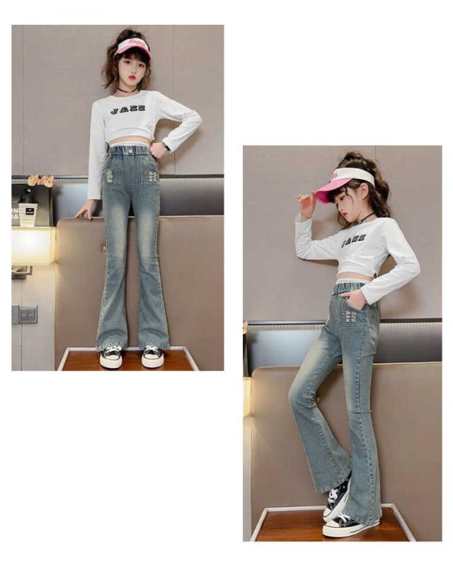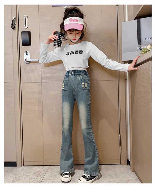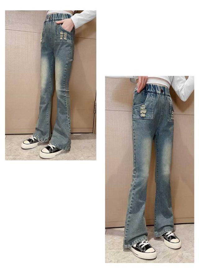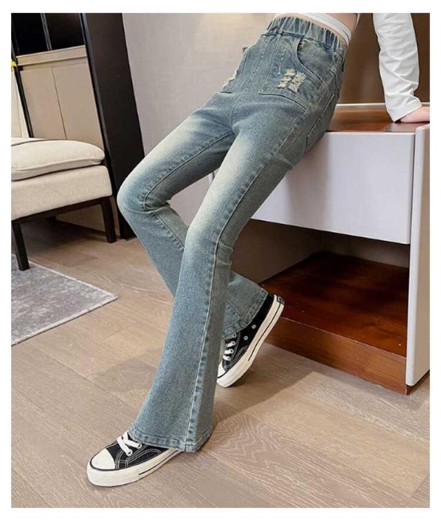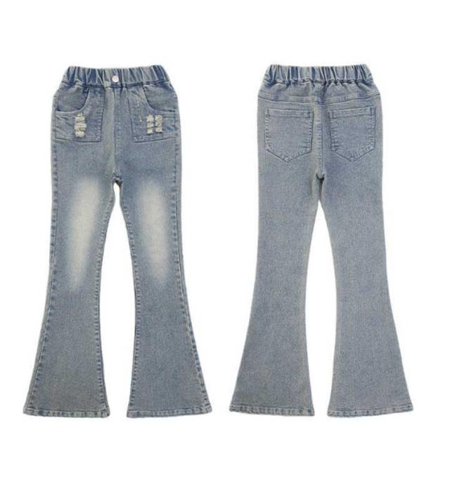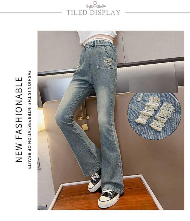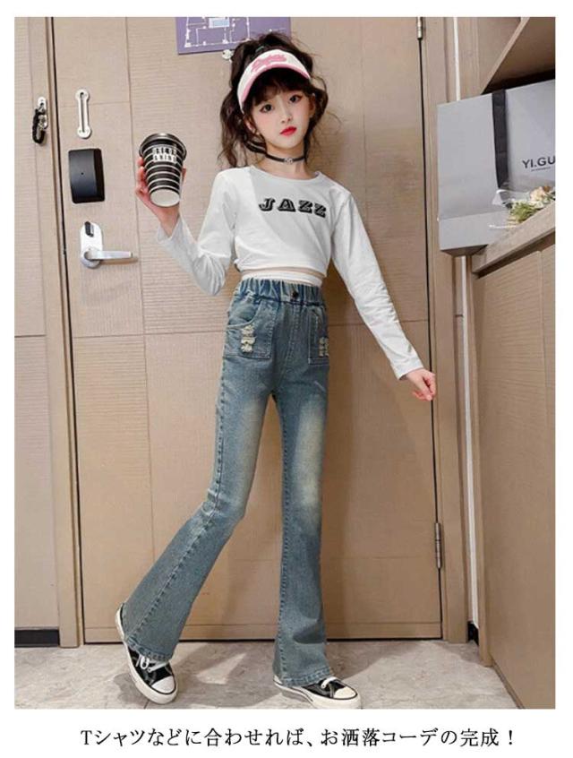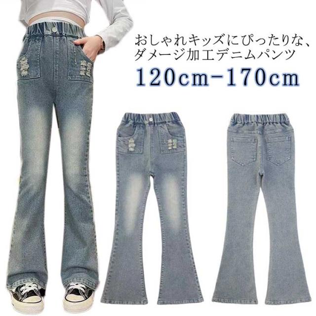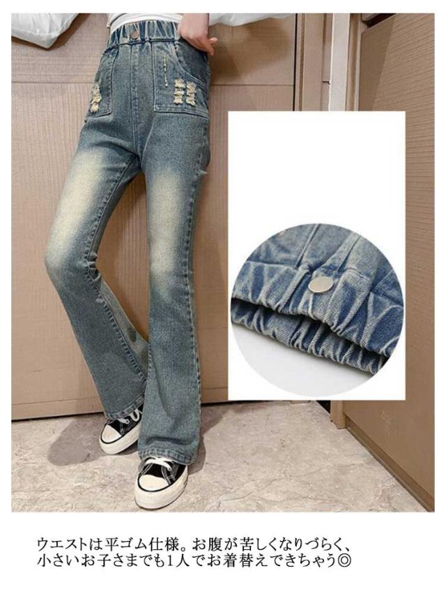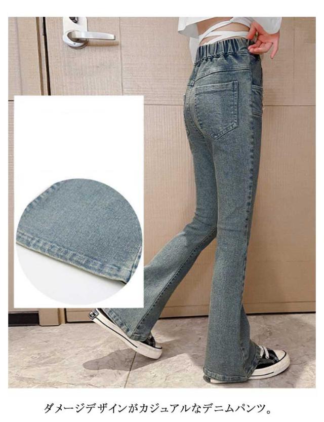 キッズ デニム パンツ ダメージデニム ダメージジーンズ ダメージパンツ フレアパンツ ロングパンツ ストレッチ 細身 スリム ウェストゴム 子供服 子ども服 ジーンズ ズボン ジーパン ボトムス 長ズボン おしゃれ 春 夏 秋