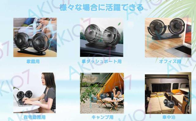4.幅広い用途:USB式なので、モバイルバッテリー、パソコン、コンセントで利用いただけますので、車用扇風機としてはDC12V/24V兼用なので、普通の自動車から中型・大型トラックも利用できます。フォークリフト・マリンなどは勿論、オフィスや家庭用としても活躍できます。