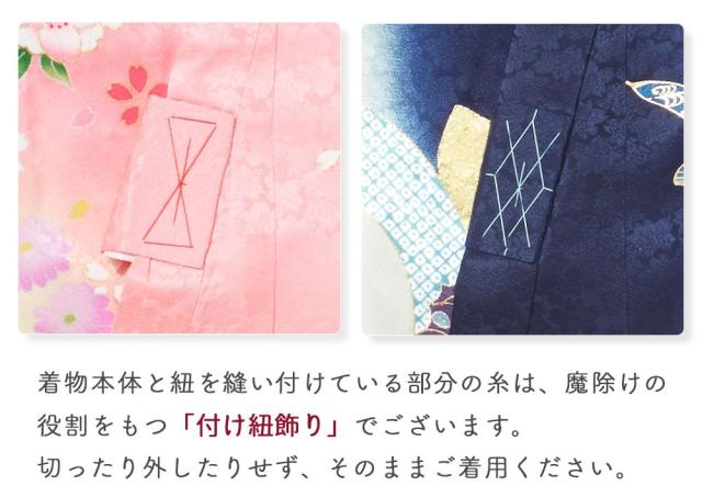 ※着物本体と紐を縫い付けている部分の糸は、魔除けの役割をもつ「付け紐飾り」でございます。切ったり外したりせずに、そのままご着用ください。