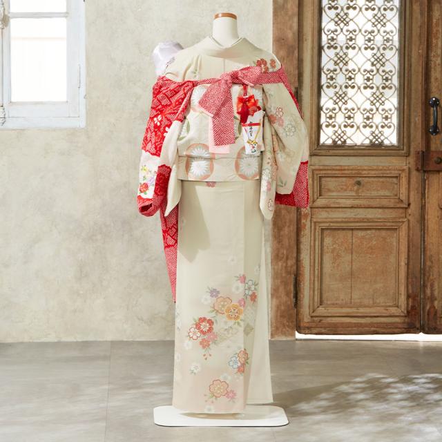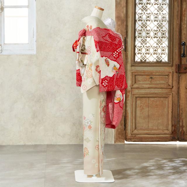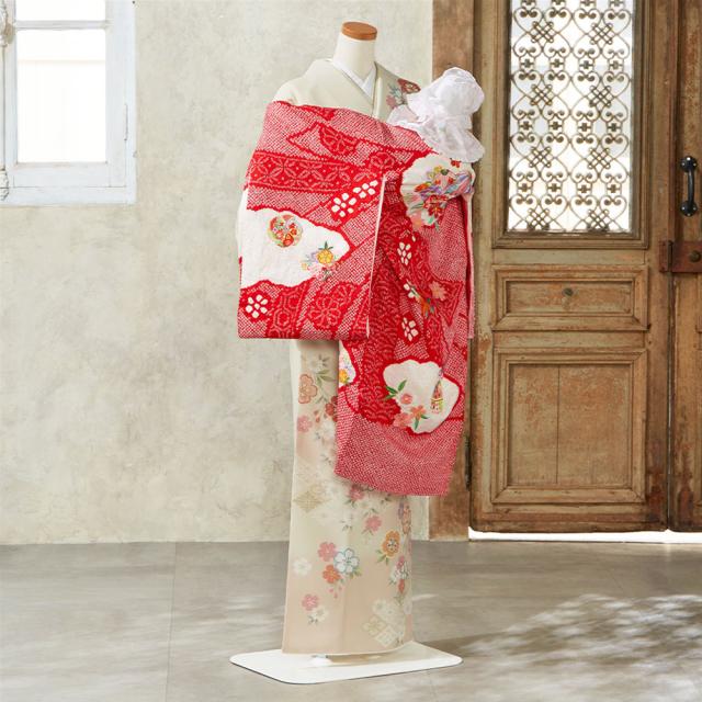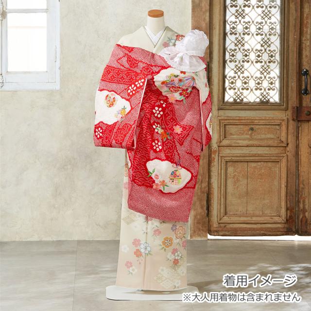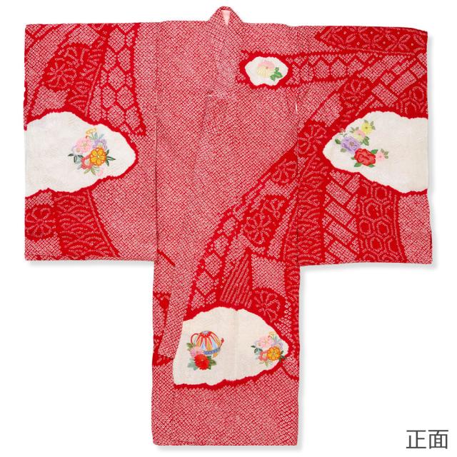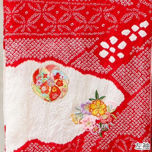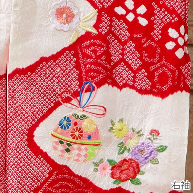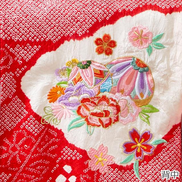 赤色の絞りの着物に、縁起の良い桜・毬・束ね熨斗などの柄をあしらい、刺繍が入った可愛らしいデザインです。
