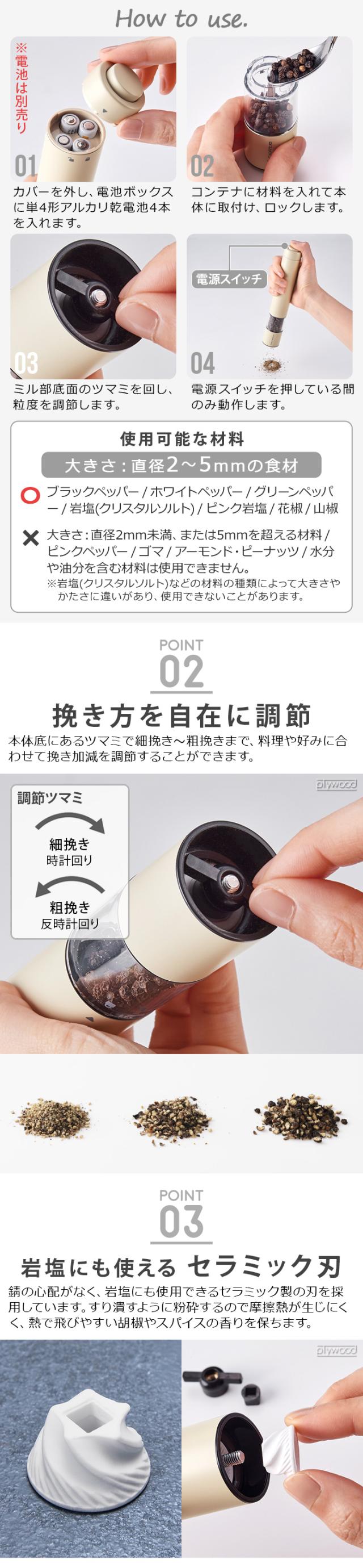 | ≪使用可能≫ 「大きさが直径2〜5mmの材料」 ブラックペッパー/ホワイトペッパー/グリーンペッパー/岩塩(クリスタルソルト)/ピンク岩塩/花椒(ホアジャオ)/山椒など ≪使用不可≫ 「大きさが直径2mm未満、または5mmを超える材料」 ピンクペッパー/ゴマ/アーモンド・ピーナッツ/水分や油分を含む材料 ※岩塩(クリスタルソルト)などの材料の種類によって大きさ、かたさに違いがあり、使用出来ないことがあります。 |