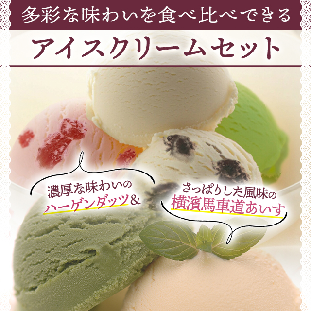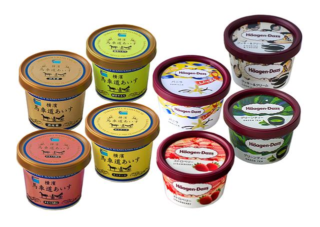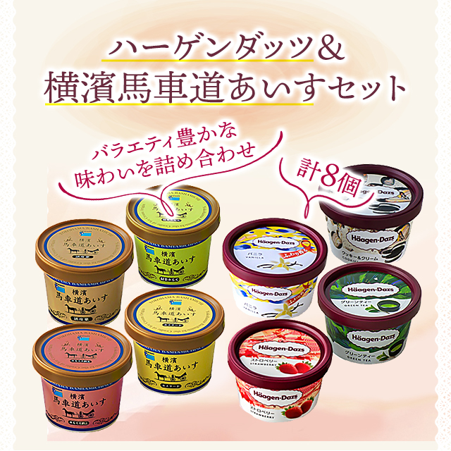 ・ハーゲンダッツと横濱馬車道あいすをそれぞれ4種類セットでご案内。家族で好みが違うときでも、好きな味を選べます。