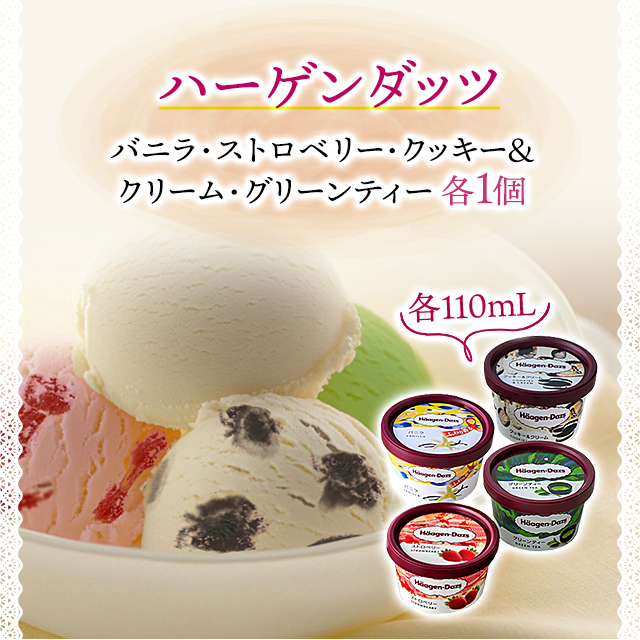 ・ハーゲンダッツセット内容:バニラ・ストロベリー・クッキー&クリーム・グリーンティー。