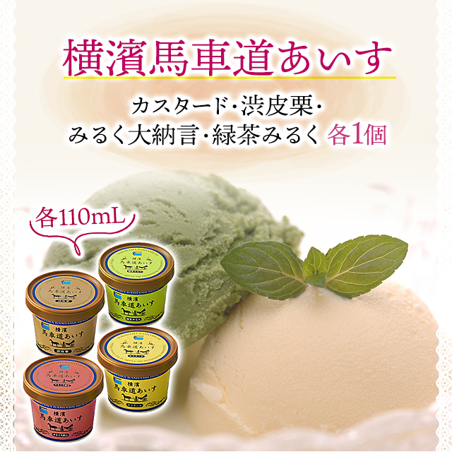 【馬車道あいす】各110ml×計4個(カスタード・渋皮栗・みるく大納言・緑茶みるく)