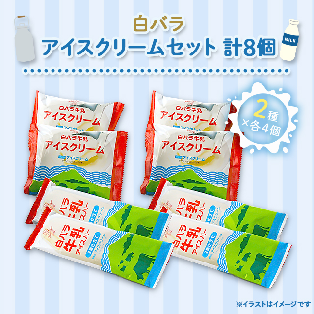 商品名 【お歳暮】白バラアイスクリームセット 計8個/2種×各4個 WR8 容量 計8個(白バラ牛乳アイスクリーム100mL×4個・白バラ牛乳アイスバー2層仕立て80mL×4本) 原材料名 【白バラ牛乳アイスクリーム】加糖脱脂れん乳(鳥取県製造)、バター、牛乳、脱脂粉乳、水あめ、砂糖/乳化剤、安定剤(増粘多糖類)、香料、着色料(カラメル)、(一部に乳成分を含む)