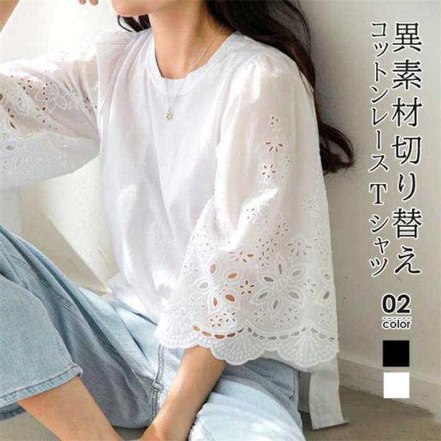 【短納期】シャツ レディース ブラウス 七分袖 ワイドシャツ 夏 トップス 体型カバー Uネック オーバーサイズ 大きいサイズ レース