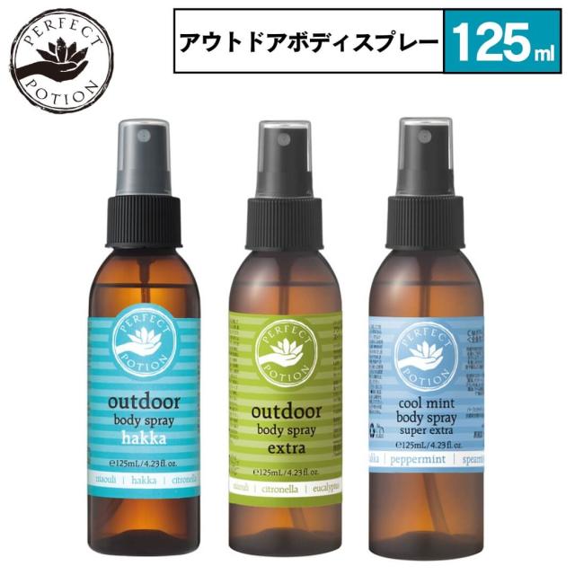 PERFECT POTION パーフェクトポーション アウトドア ボディスプレー 125ml エクストラ ハッカ クールミント 蒸し暑い日本の夏にピッタリ!直接お肌にスプレーできる冷感ボディスプレー 外で過ごすのが心地よい季節。でも、気になるのは強い日差しや蒸し暑さなど、夏特有の刺激です。 そんな時に頼れるのが、天然由来成分100%でつくられた「夏の爽やかケアアイテム」。 妊婦さんや生後6か月のお子さま(※クールミント ボディミストは2歳以上推奨)も安心して使えるやさしさで、家族みんなの肌を守りながら心地よい時間をサポートします。目的や好みに合わせて選べる3つのタイプ。 【エキストラ】 すっきりシャープな清涼感を重視したい方におすすめ。シトロネラやペパーミントをベースに、鼻をスーッと抜けるような爽やかな香り。夏の屋外でアクティブに過ごしたい時にぴったりです。 【ハッカ】 涼しさは欲しいけれど、少し甘くやさしい香りを楽しみたい方に。清涼感の中に、キャンディのようなほんのり甘いハッカの香りが広がります。お子さまにも親しみやすい、やわらかい香り立ちが特長です。 【クールミント 】 暑さと湿気によるムレ・ベタつきが気になるときに、全身にひんやりとした涼感を与えるボディ用ミスト。天然メントール2倍配合(従来品比)で、シュッとひと吹きするだけで全身に清涼感が広がり、心までリフレッシュ。2歳以上のお子さまから大人まで、全身にたっぷり使えます(顔への使用は不可)。細かいミストが素早くなじみ、さらっと快適な使い心地です。 「お出かけにも、おうち時間にも」 ・お散歩やキャンプ、ガーデニングなどの屋外にでかける時に ・緑の多い場所にお出かけの時に。天然アロマで虫に対する忌避性効果を高めたい時に。 ・レジャーやスポーツに ・通勤・通学時のリフレッシュに ・ドライヤー前後の首元クールダウンに ・ルームミスト代わりにも ・寝苦しい夜に ・気分転換したいときに たくさんお外で遊んで、たくさんの思い出を作ってほしい。小さなお子さまが、夏の野外でも思いっきり自然と触れ合えるようにアウトドアボディスプレーをぜひお役立てください。 [キーワード] パーフェクトポーション アウトドアボディスプレー 虫除けスプレー アロマスプレー エクストラ ハッカ クールミント 蚊 虫よけ バズオフ パーフェクトポーション 虫よけスプレー 天然成分涼感 虫対策 赤ちゃん OK 子供 安心夏対策 ナチュラル 虫対策グッズ 室内用 屋外用 空間スプレー キャンプ用品