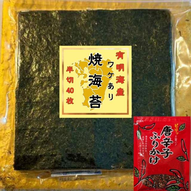有明海産 訳あり 焼き海苔 半切り40枚【スタッフおすすめ/唐辛子ふりかけ 1袋(ふりかけの元祖/創業大正二年)付き】 のり 海苔 ノリ 焼きのり