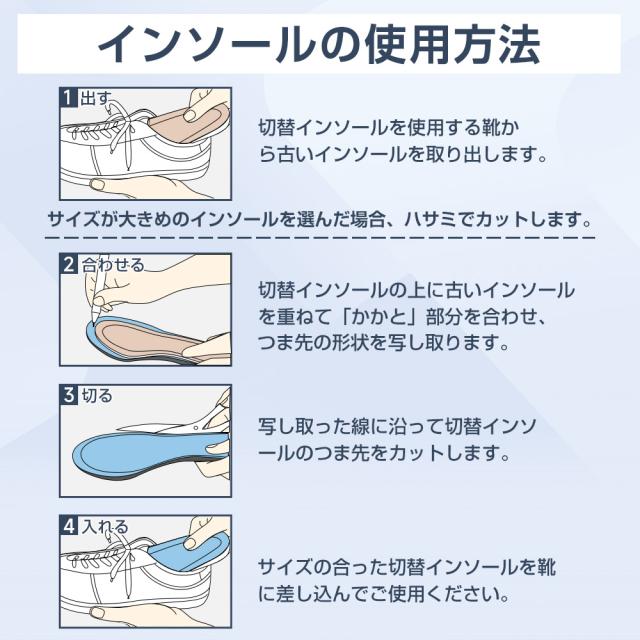 ※少しずつ切ってサイズ調整をおこなって下さい。切りすぎると中敷きが靴の中で動く原因となりフィット感が損なわれます。