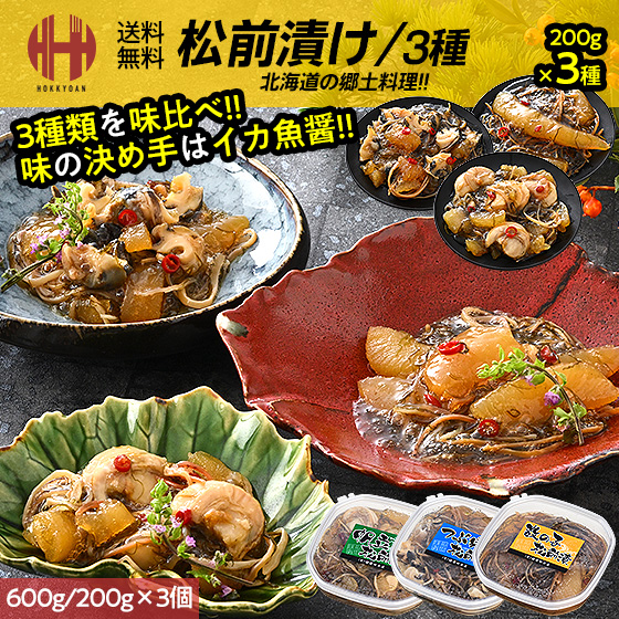 600g(数の子松前漬け200g×1個、帆立松前漬け200g×1個、つぶ貝松前漬け200g×1個)