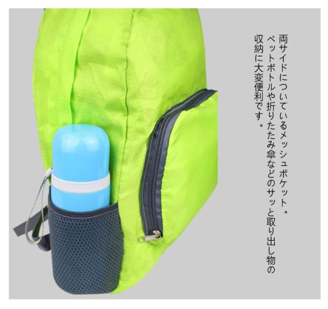 | 収納時は軽量・コンパクトなので持ち運び可能で、使用時はしっかりしたリュックに早変わり。 旅行時のサブバッグや買い物時のエコバッグ、防災時の非常持ち出し袋としてもおススメ! 急に荷物の多くなる旅行や買い物、持っていくものが多いアウトドア時でもこのバッグがあれば安心!がばっと広げて出し入れ楽々!大容量で荷物を収納できます。 両サイドについているメッシュポケット。ペットボトルや折りたたみ傘などのサッと取り出し物の収納に大変便利です。 生活防水加工生地を使用しておりますので少し濡れても安心です。 | |