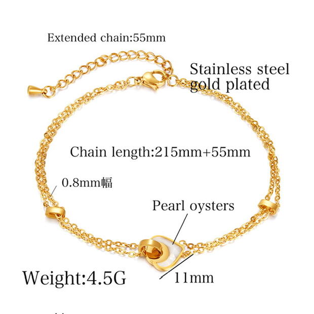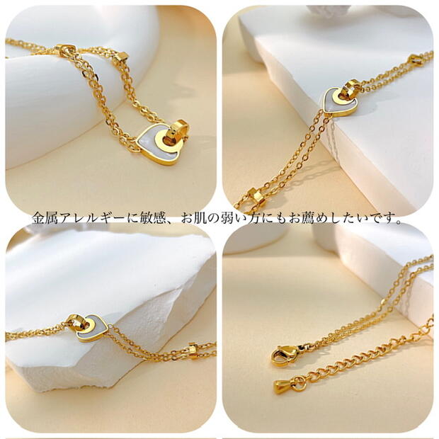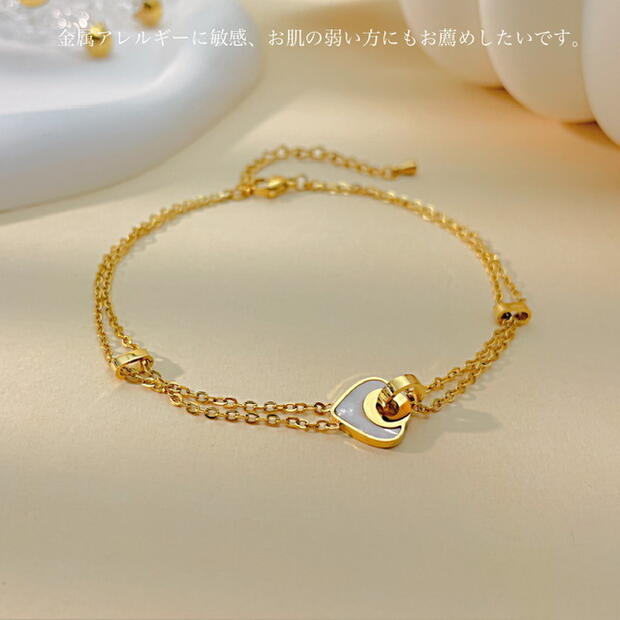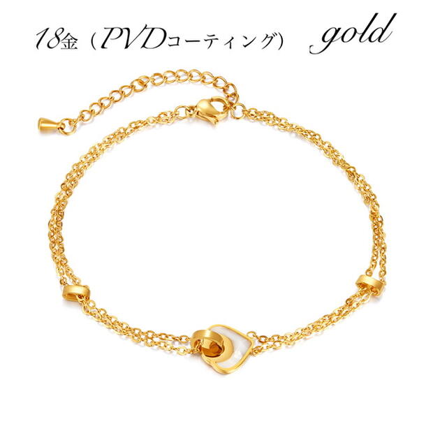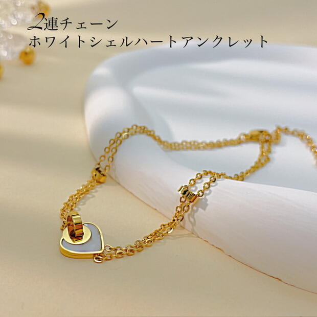 アンクレット つけっぱなし サージカルステンレス アンクレット レディース シンプル 金属アレルギー 2連チェーン 18金仕上げ ホワイトシェル ハート アンクレット ステンレスチェーン アンクレット ニ連 細め 18K ゴールド 人気 華奢 上品 カジュアル かわいい おしゃれ