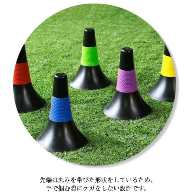 | 10本セット!アイディア次第で使い方が広がるリップコーンです。 底面が広がり形状になっているため、ドリブルの振動による衝撃を受けても転倒しにくい作りになっています。 楽に持ち運べる軽さと衝撃に強い丈夫さを兼ね備えたPP素材を採用しています。 滑り止め加工を施した、滑りにくく汗をかいた手でも掴みやすくなっています。 先端は丸みを帯びた形状をしているため、手で掴む際にケガをしない設計です。 使用後は重ねることができるため、持ち運びや保管がしやすいところも嬉しいポイントです。 バスケットボール・サッカー・フットサルなどのドリブル練習に重宝する。 | |
