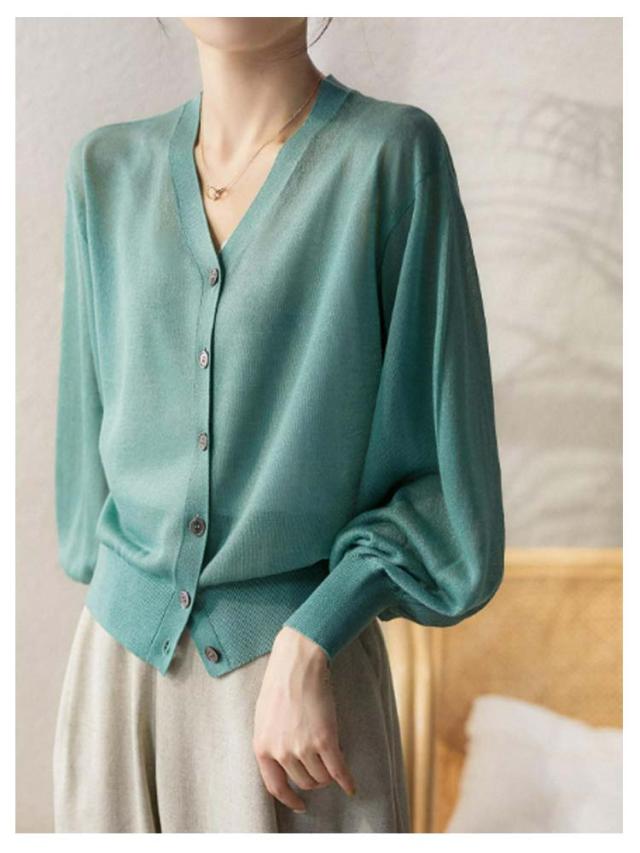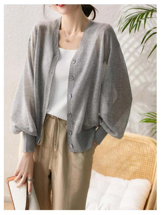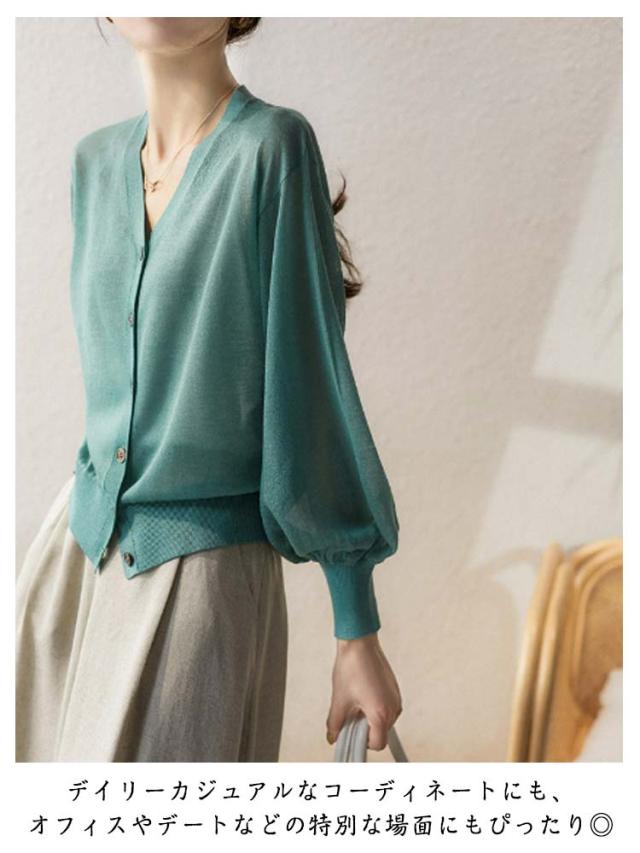 カーディガン サマーカーディガン サマーニット 無地 透け感 ショート丈 オフィス 夏 仕事 ゆったり 薄手 レディース パフスリーブ 長袖 通勤 冷房対策 涼しい vネック ニットカーディガン 羽織 ショート丈 紫外線対策 UVカット